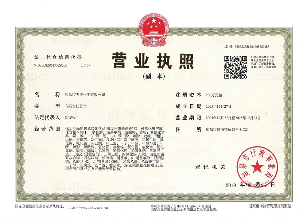 ? 如皋市天成化工有限公司創(chuàng)建于1996年。公司地處于美麗富饒的長江三角洲,座落在古鎮(zhèn)林梓,通揚運河河畔。南瀕長江、西臨204國道,距南通港、飛機場30公里,立體交通發(fā)達。公司經營管理規(guī)范,技術力量雄厚,擁有一批高、中級專業(yè)技術人才。